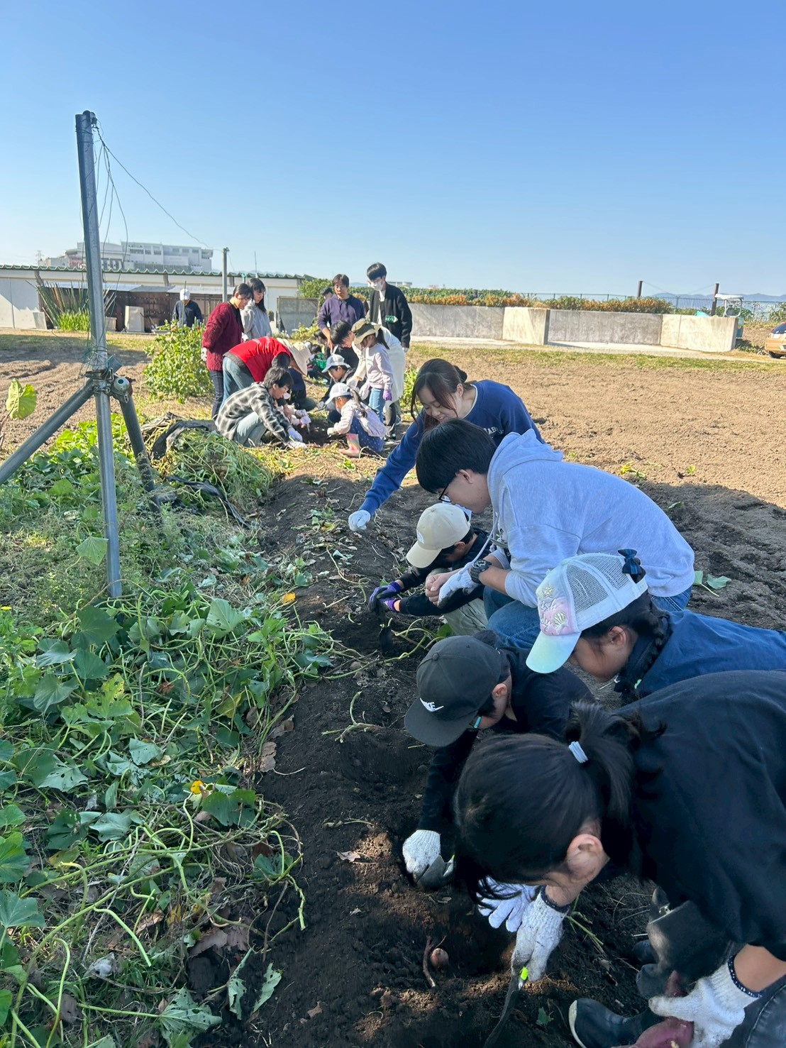豊中つばさ公園ma-zikaでぴったんこ同窓会を行いました。給食の食べ残しを用いた肥料「とよっぴー」の説明を聞いたり、へちまたわしを作ったり、さつまいも掘りや稲刈りを行ったりしました。
