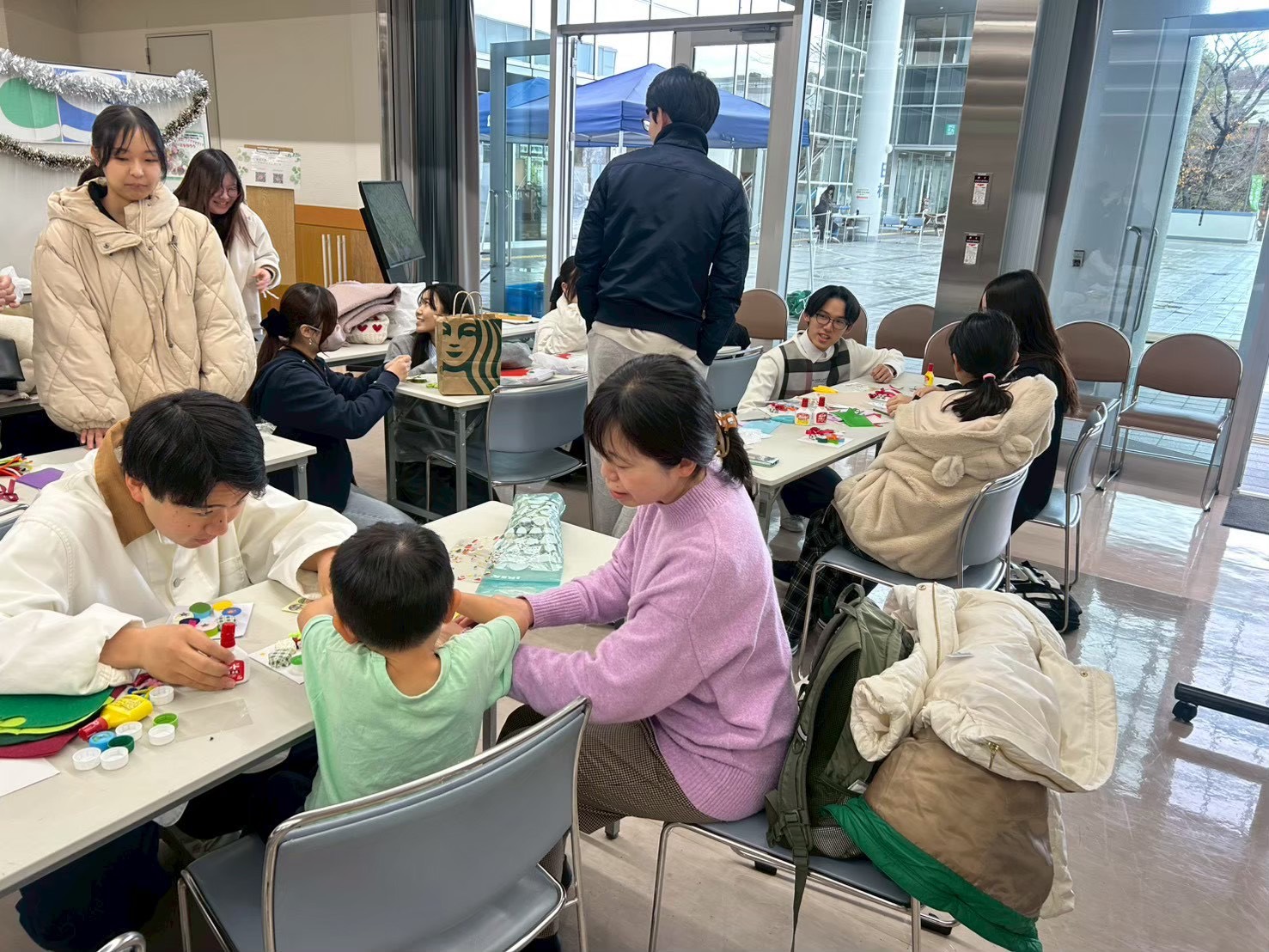 今回のワークショップのテーマは季節に合わせてクリスマスオーナメントです!輪っかの形に切ったペットボトルを何個か重ねて球を作り、こどもたちはシールやペンを使って好きな模様で装飾していました!こどもたちが楽しそうに作る姿を見ることができ、非常にやりがいを感じることができました!