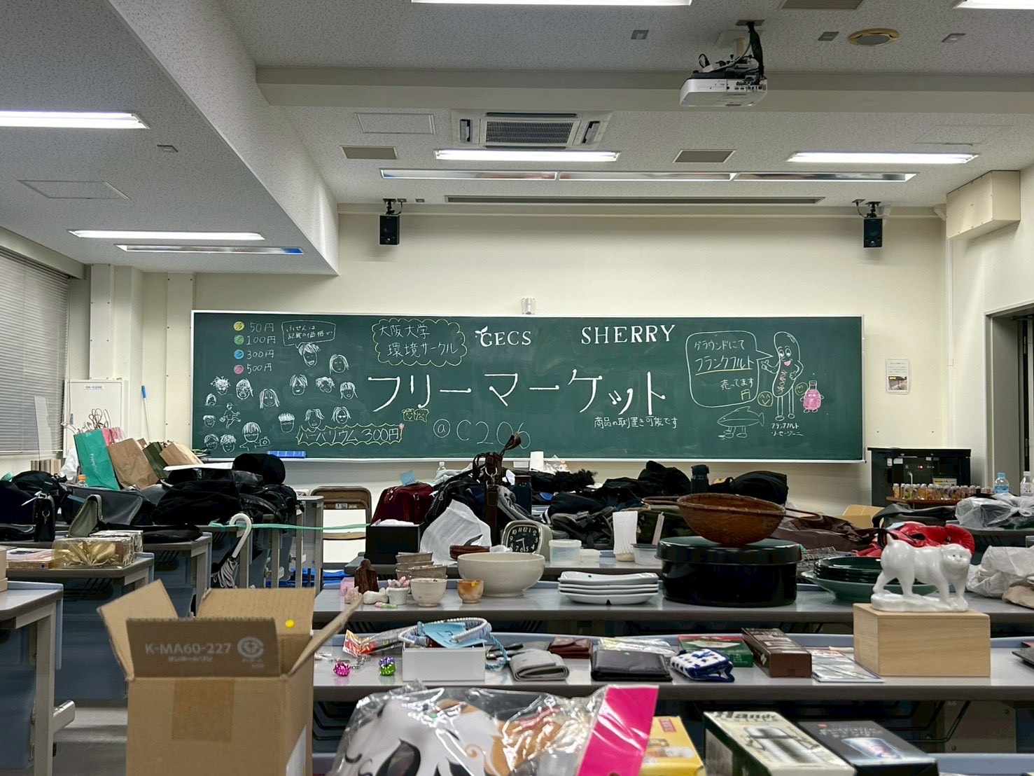 今年もまちかね祭にて恒例となっているフリマを開催しました!物品は大学周辺の住民の方から提供していただき、回収した物品を大学まで運んで教室で販売しました。1日目は悪天候の影響で来客は少なかったですが、2日目、3日目は多くのお客さんに来ていただき、ほぼすべての物品を販売することができました。物品を提供していただいたみなさん、フリマに足を運んでくださったみなさん、ありがとうございました!今後ともよろしくお願いします。